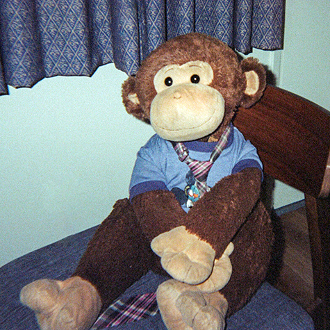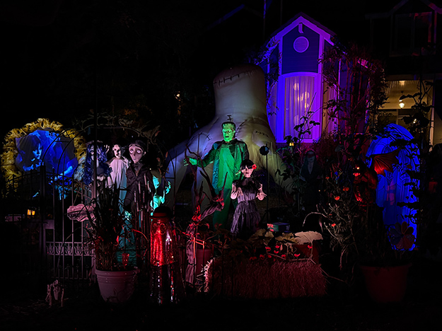 After dinner we drove over to the heart of Toluca Lake to walk around and check out the Halloween decorations. We took Chan along, and at one point hims made a friend. There was a young girl that was standing in front of one of the decorated homes, showing Chan a severed hand. Chan gave her a high five. To both the severed hand and her hand. Nice. That monkey has his charm.