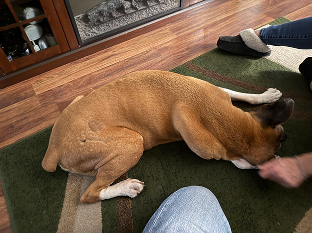 The vet gave us time to say goodbye. The three of us, TheGirl, her daughter, and me, said our goodbyes. We were with her until the end, like TheGirl wanted. It was a shock, and now she's gone. I'll never have the pleasure of having her lick my face ever again. I loved Cheyenne very much, and her passing is going to hurt forever. She was a significant part of my life for the last eleven plus years. When they put the first drug into her she went to sleep, and started to snore. The running joke was that when we snore we are sawing the wood to build our cabin in the woods. After they injected the second drug that stops the heart Cheyenne slowly got quiet. Until she was gone. I leaned in and told her, "You finished your cabin."