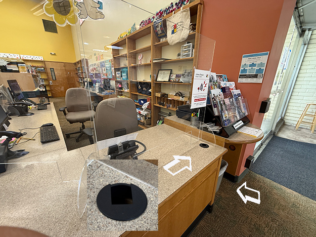 A patron came up to the desk and asked Vivian where the trash can was located. Vivian tells the man, Around the corner, and points in the general direction of the trash can. I admit, it's a little hidden, but what this patron did next was another what is going on here moment. The desk have little holes that are for the wires that come up from under the desk to the desk top. This idiot puts his snot rag in that little hole. Of course Vivian is disgusted. Why would this guy think this little hole was the trash can? ARGH! People are so stupid.