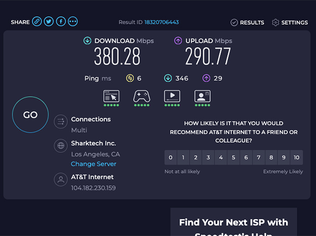 The first speed test was slow, but the second, and subsequent ones, have been nice and fast. Easily over 300 mbps on both upload and download. From my old speeds of 25 mbps to now is a 1,100% jump in speed. Nice. No more buffering.