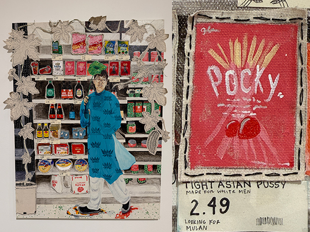 One of the art pieces in the new show is called Bitter / Asian aisle by Michael Tran. It has some interesting details, like a box of Pokey with the price tag describing the product as tight Asian pussy.