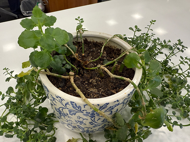 Since Sarah left no one, that I can see, waters the plant at the main desk. I poured a little water from my bottle. Sarah would tell me that the plant only needs to be watered every two weeks, so that's what I'll try to do.
