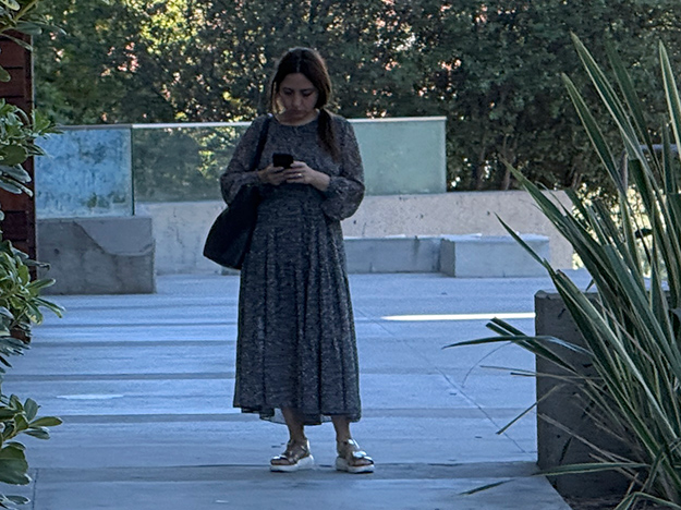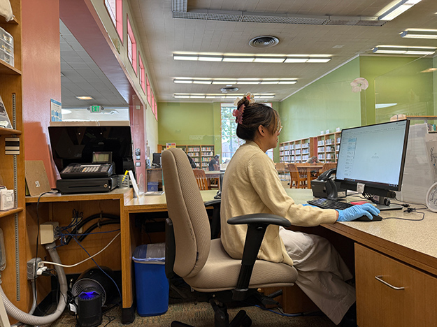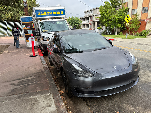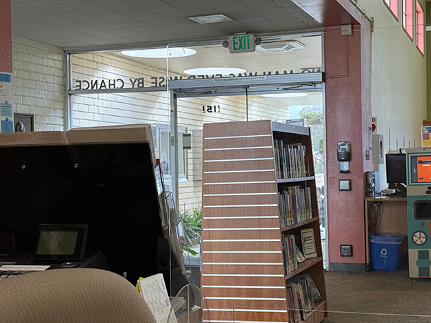 I was packing the van for the day when I saw a pretty girl walking on the sidewalk. She kinda looked in my direction, but more towards the library. She walked towards the front of the library and that's when I lost track of her. Then I saw her again (above) and then I turned the corner. When I came out again with more book bins she was on the walkway. She came up to me and said she wanted to check in a book. I took the book and saw her name.