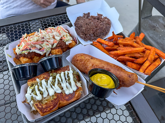 One of the places I wanted to try in Solvang was the Copenhagen Sausage Garden. So after settling in and getting a little whiskey in me I made my way to the center of town for some good eats. When I got to the front of the line I had some idea what to get, but I asked if the guy at the register had any suggestions. Instantly I knew I had made a mistake when the guy said to me that everything was good. Yeah, that's his way of just saying get what you want. So I got the first three that I had on my list. Never again.