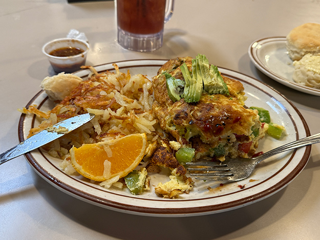 I've been wanting to try a diner in Buellton called Mother Hubbard's for a while. But every time I've been up to Buellton I would go to Andersen's instead. Now that Andersen's is closed I took the opportunity to finally visit Hubbard's, and it was good. I was hoping to get some chilaquiles from Breakies, but they were super busy and I wanted to avoid people. Mother Hubbard's had a good crowd, but no one else was sitting at the counter, so that's where I sat. The waitress said one of the specials was a tri-tip omelet. Sold! It was good, but huge. I took half of it home with me.