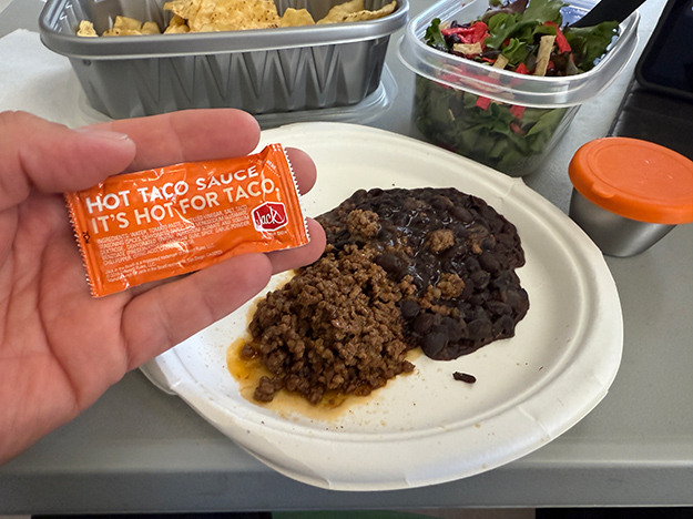 When I pack my lunch in the morning I grab and go. I try to put things together for the next day, but I sometimes fool myself. On Tuesdays I get my lunch ready in the fridge for Wednesday and Thursday. Because when I get home on Wednesday nights I've had a couple and I am feeling nice. And sometimes I forget in my hast. So I set up two containers of 1,000 island dressing, and a container with hot sauce. Well, in my hast this morning I grabbed the two containers of dressing. D'oh! So I had double dressing, but no hot sauce. But, I went to Jack in the Box last week, and while ordering their tacos they gave me like ten packets of their hot sauce. I kept a few in my lunch pale and I used them today. Saving my lunch.