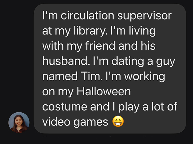 The little information TheNewCute gave me is that she's circulation manager at her library, and that she's dating a guy named Tim. Who is this Tim character? She also sent me a bunch of pictures saying that was her year back home. She looks happy, and that's what counts.