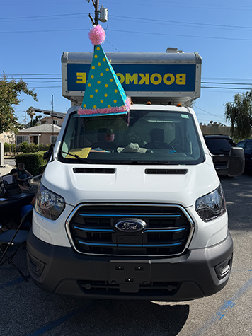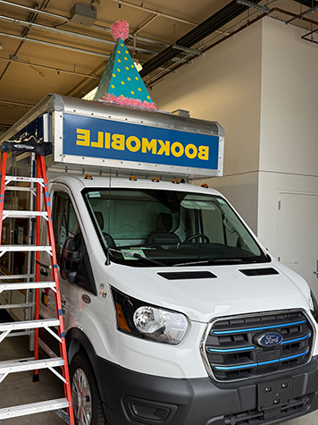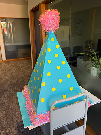 The birthday hat is complete and ready for Saturday. I will still need to secure a tall ladder from Stephanie. Because otherwise I have no way of getting the hat on top of the bookmobile.