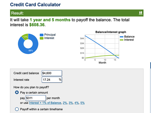 I went online to find a payment calculator to see exactly how long it will take me to pay off my credit card bills. If I continue paying $311 to American Express I will supposedly pay it off in about a year and a half (see above). Good. That is about $600 a month that I will gain back after I pay both my Am Ex and Discover card. And, when I pay off my Am Ex I can use that money to pay Discover a little faster. The calculator estimates two years for my Discover card to be paid off. I didn't realize how low an interested, relatively, Discover charges. They only charge me 11.24% APR. That's high, but for a credit card that's low. Some banks charge in the mid to high 20% range. Am Ex charges me 17.24% APR. High, but again, not in the 20% range like others do. Still, it's time to pay these off and have that money for me.