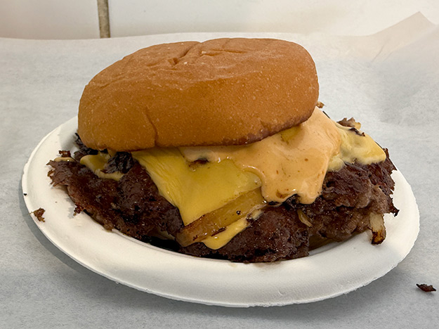 I didn't bring lunch with me today because I wanted to eat a burger at this place named For the Win. It's another one of these smash burger joints that popped up a few years ago and is now the burger trend here in Los Angeles. I had planned on walking there from the library, but it was so damn hot I just drove the bookmobile there. The burger itself wasn't bad, it was good. These days there are so many of these smash burger places that it's hard to keep track of them. The burger from Burgers never say Die is better. So is the one from the Win-dow. Again, this is not a bad burger. But... it cost me $14, and I think the other two cost me less. Oh and Bill's is also better and cheaper. RIP.