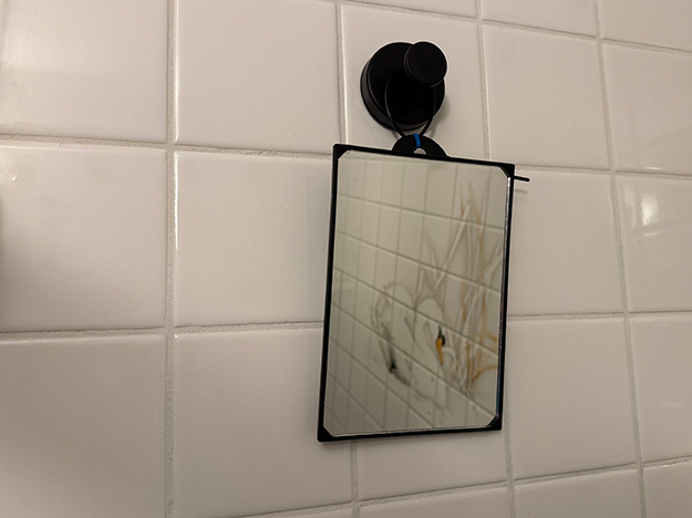 A few months ago I bought a suction cup hook to hang my towel from. The package came with two hooks, but I only needed one. Today I figured that I could use the other one to mount my mirror, for when I shave in the shower. Mission accomplished. In testing the position I got my electric razor and trimmed my eyebrows. Double mission accomplished.