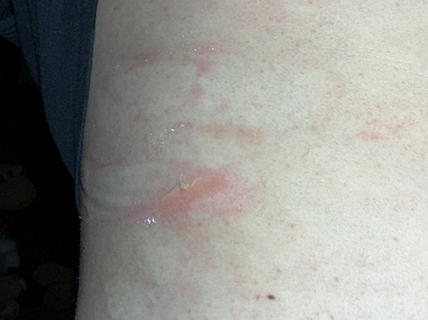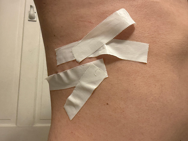 Most of the tape I had on my side was still sticking by the time I got home, but some had come off and I needed to just take everything off. When I did I noticed it was wet in some places. Had I cut myself. I checked, but it wasn't blood. It was like water, puss perhaps? Whatever it was, it was caused by the tape. A little bit of skin was cut as if there was a little puss bag. Oh well, it was the price I paid to not be in pain.